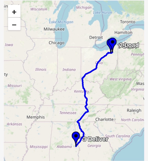 Check in at 11:29 am near Hiram, OH (or Troy Twp, OH). Backed into a dock door at 11:53 am. Advised next time can’t check in more than two hours early. Status changed to “on time to delivery”. We are starting our next trip to Opelika, AL at 12:59 pm.