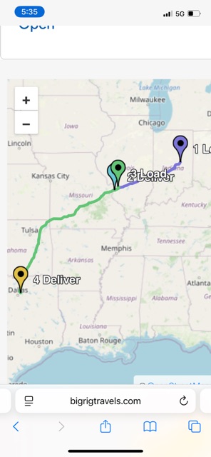 Big Rig Travels Wednesday began at 10:59 am CDT.  IT is 69 degrees and partly cloudy sky near Edwardsville, IL.  Recording is 3:41 hrs long.  Status changed to “on time to delivery.”  We are starting our trip to Garland, TX.  There is 640 miles to go.  “Buddy, buddy, let’s go!”  12 hours early, great start, “whoo whoop”  BRS says “Been awhile since we been thru Oklahoma right?” as we roll onto I-255.  BRS notes a nice little detour, IL73 near Centreville, IL to get to Love’s at 11:26 am.
